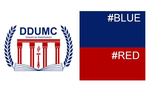 The design of the DDUMC Logo is rendered in Red and Blue. The colour red is associated with Power, Energy, Strength, Desire, Purpose and Passion, the Colour Blue is a soothing colour that signifies Faith, Trust, Devotion, Wisdom, and Honesty.